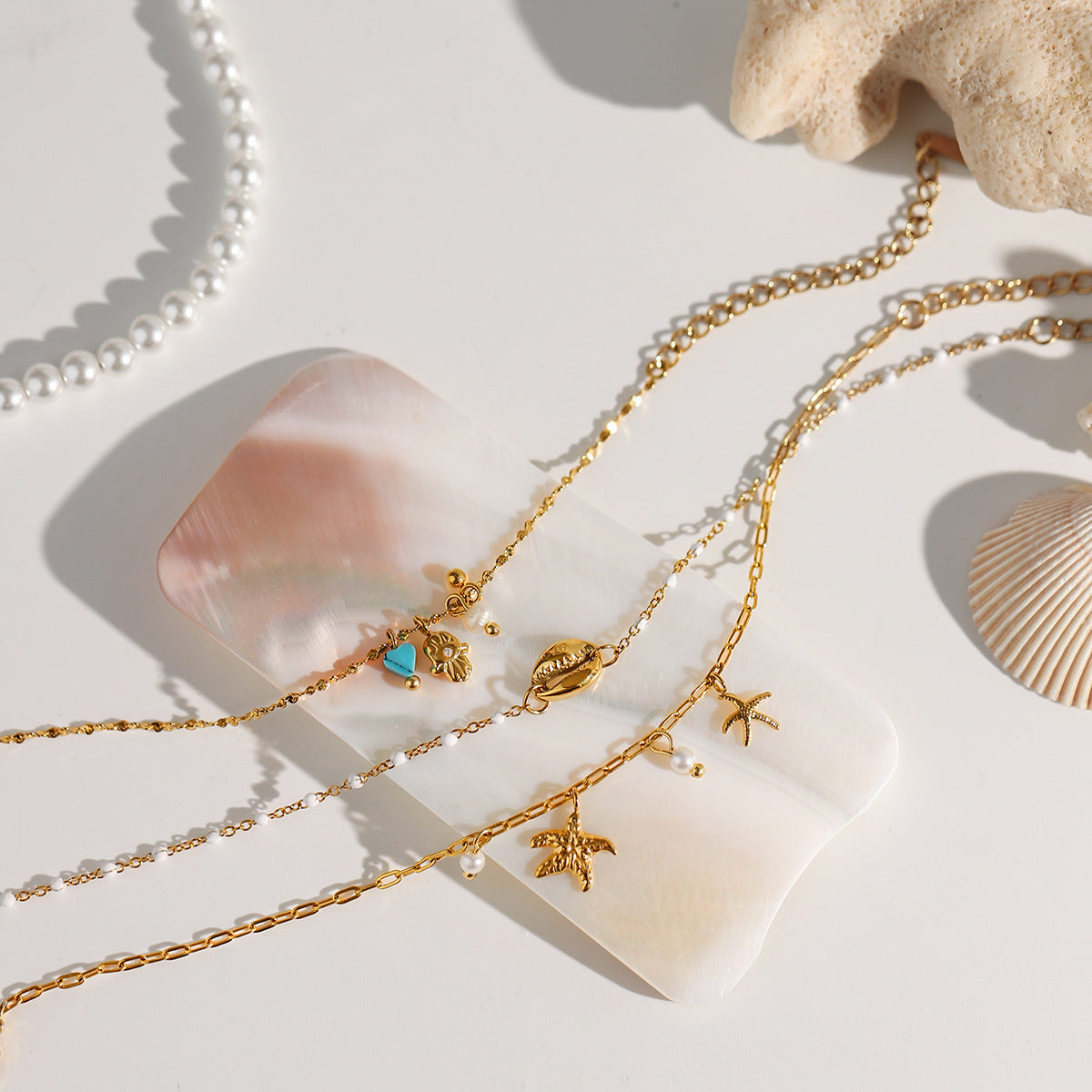 Summer beach vacation style, niche, light luxury, versatile 18K gold stainless steel pendant bracelet set