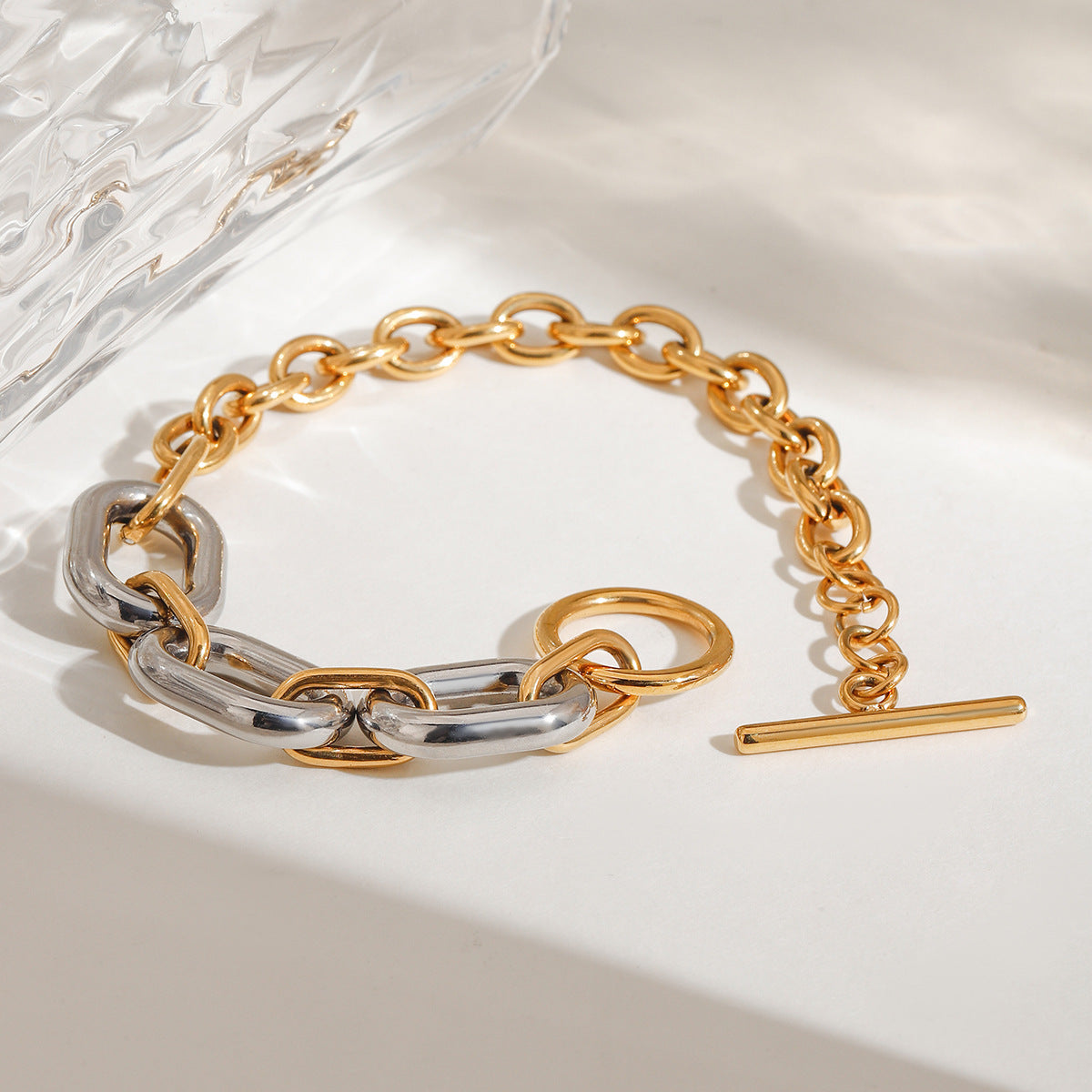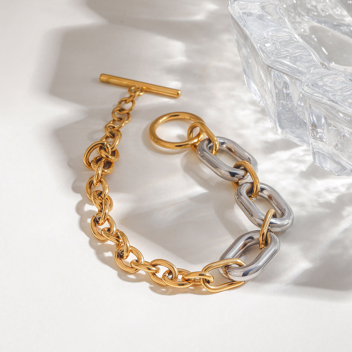 Stainless steel, gold and silver color-matched chain, oval smooth surface, hollowed-out circular OT buckle bracelet