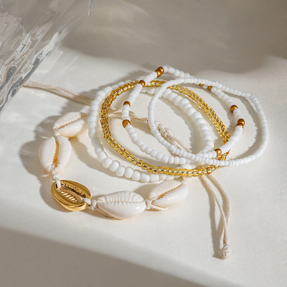 A fashionable and classic seaside and beach vacation style stainless steel rice bead shell wax rope woven foot chain set