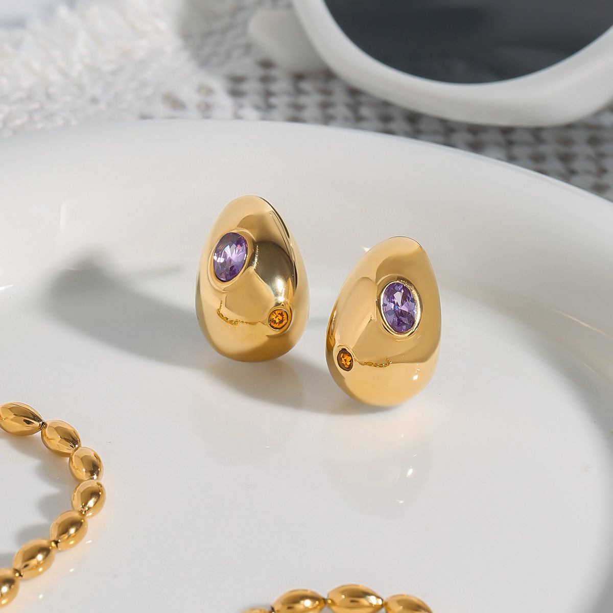 Stainless steel bean ear studs with zirconium inlaid