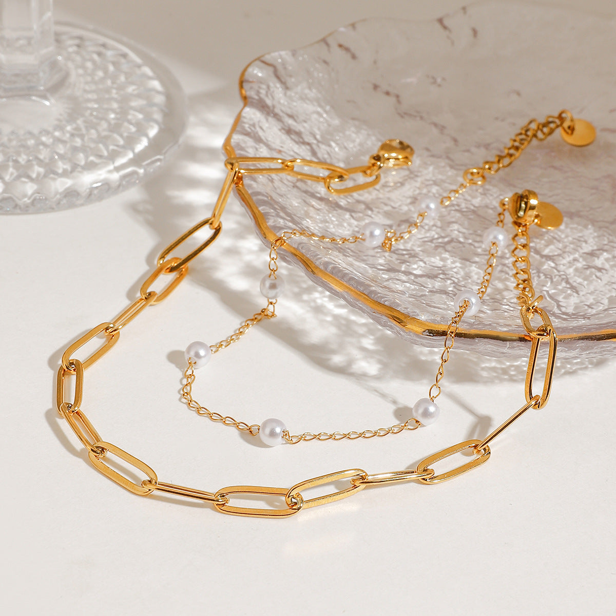 Fashionable and simple vacation style, versatile beach, stainless steel imitation pearl chain, paperclip chain, double-layer foot chain