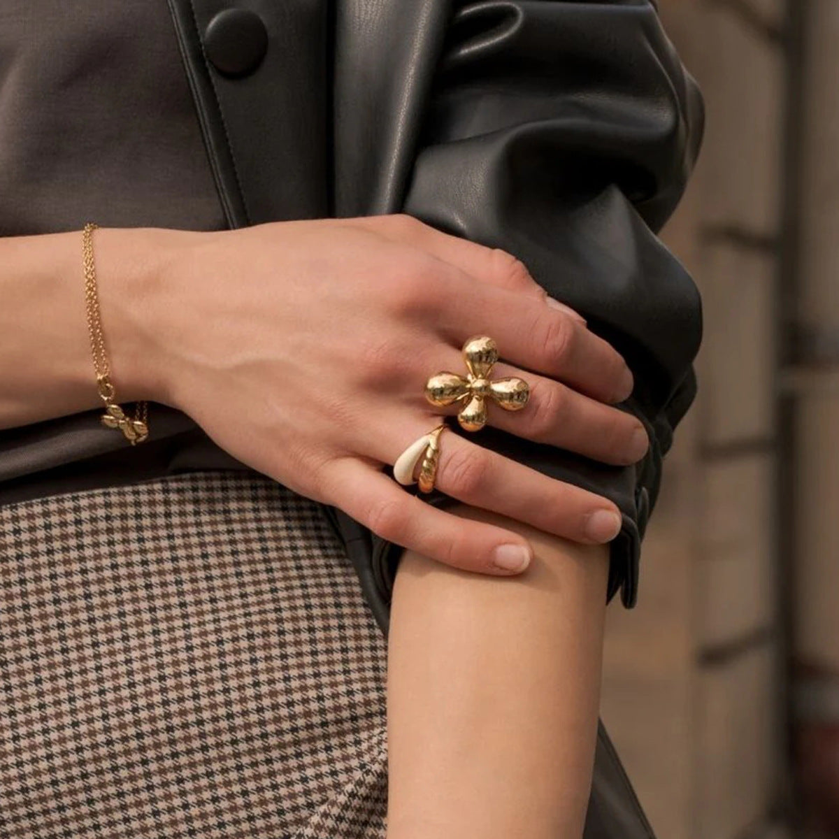 A fashionable, individual and versatile vacation style 18K gold stainless steel glossy flower four-petal flower opening ring
