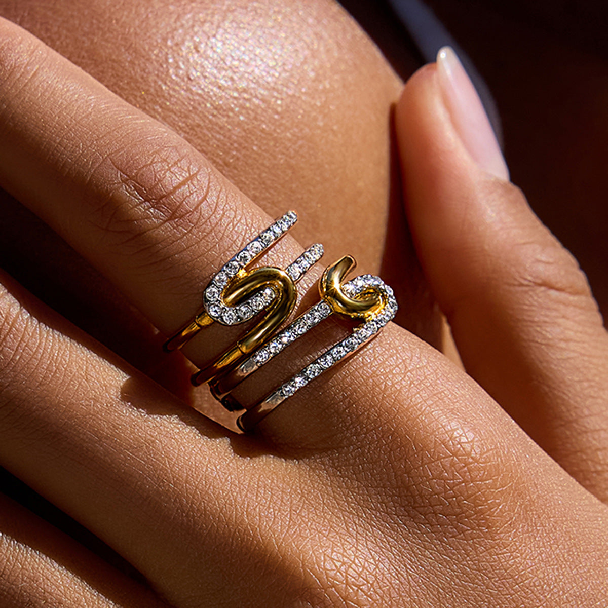 A high-end stainless steel, gold and silver color-matched water diamond ring with a niche design