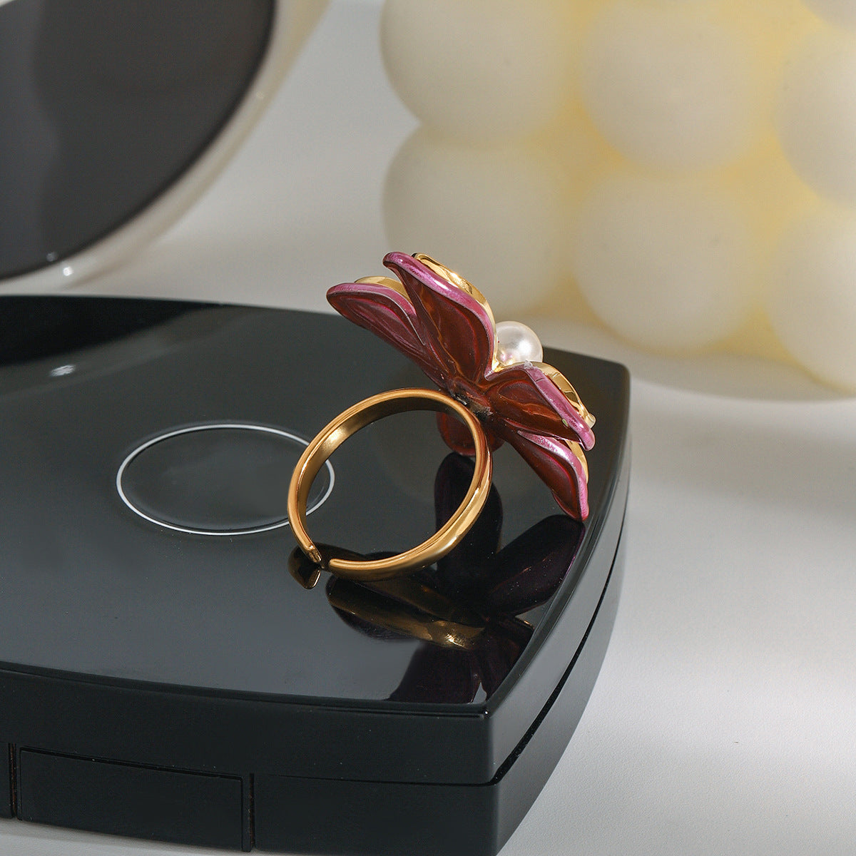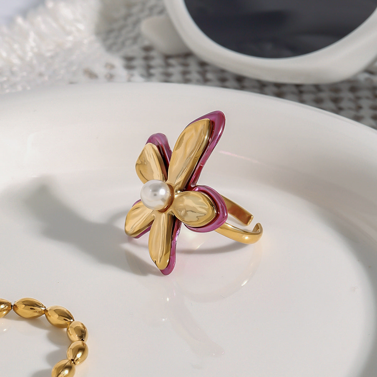 A golden stainless steel fashionable, simple and niche design flower pearl ring