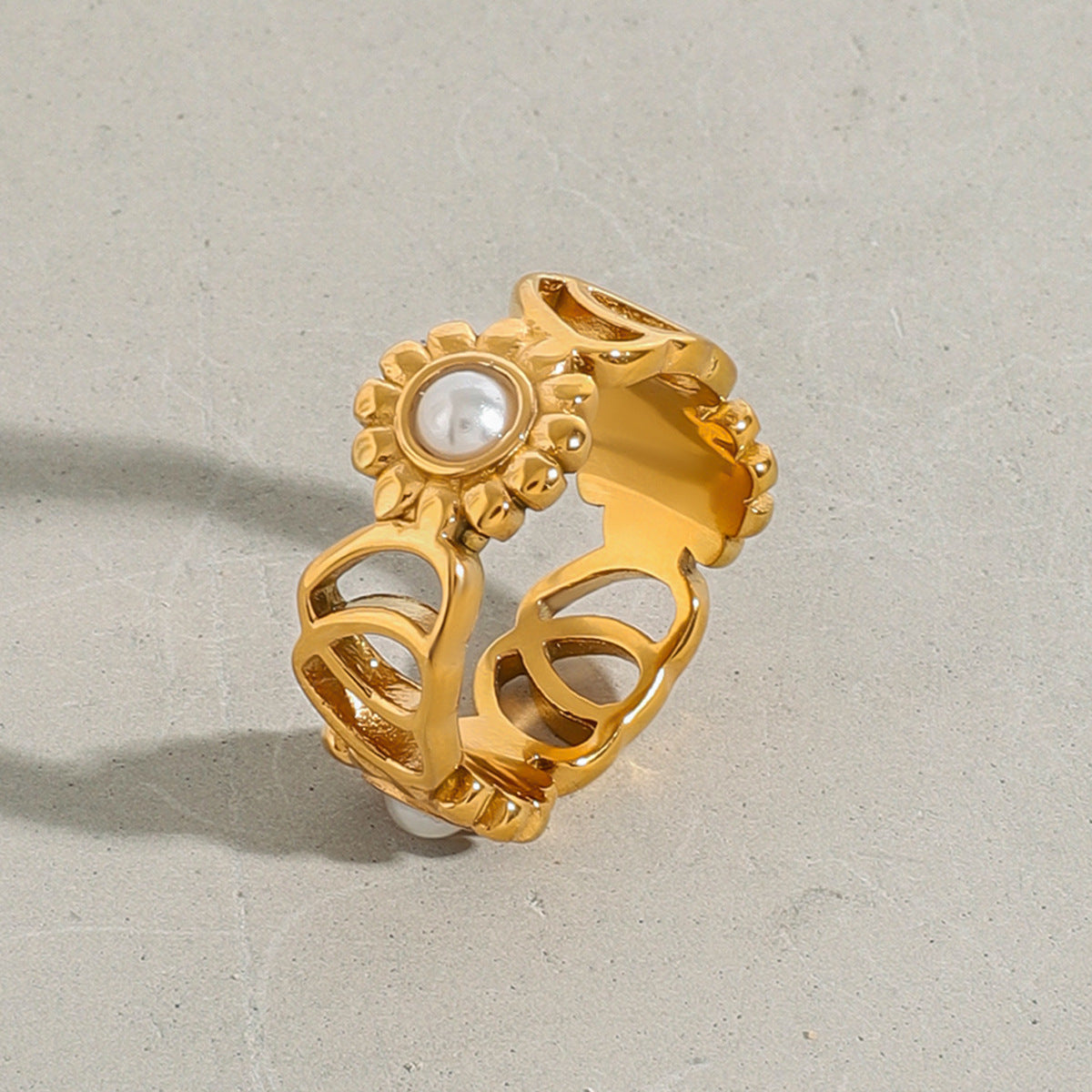 A golden, fashionable, light luxury and high-end, non-fading stainless steel sunflower heart pearl closed ring
