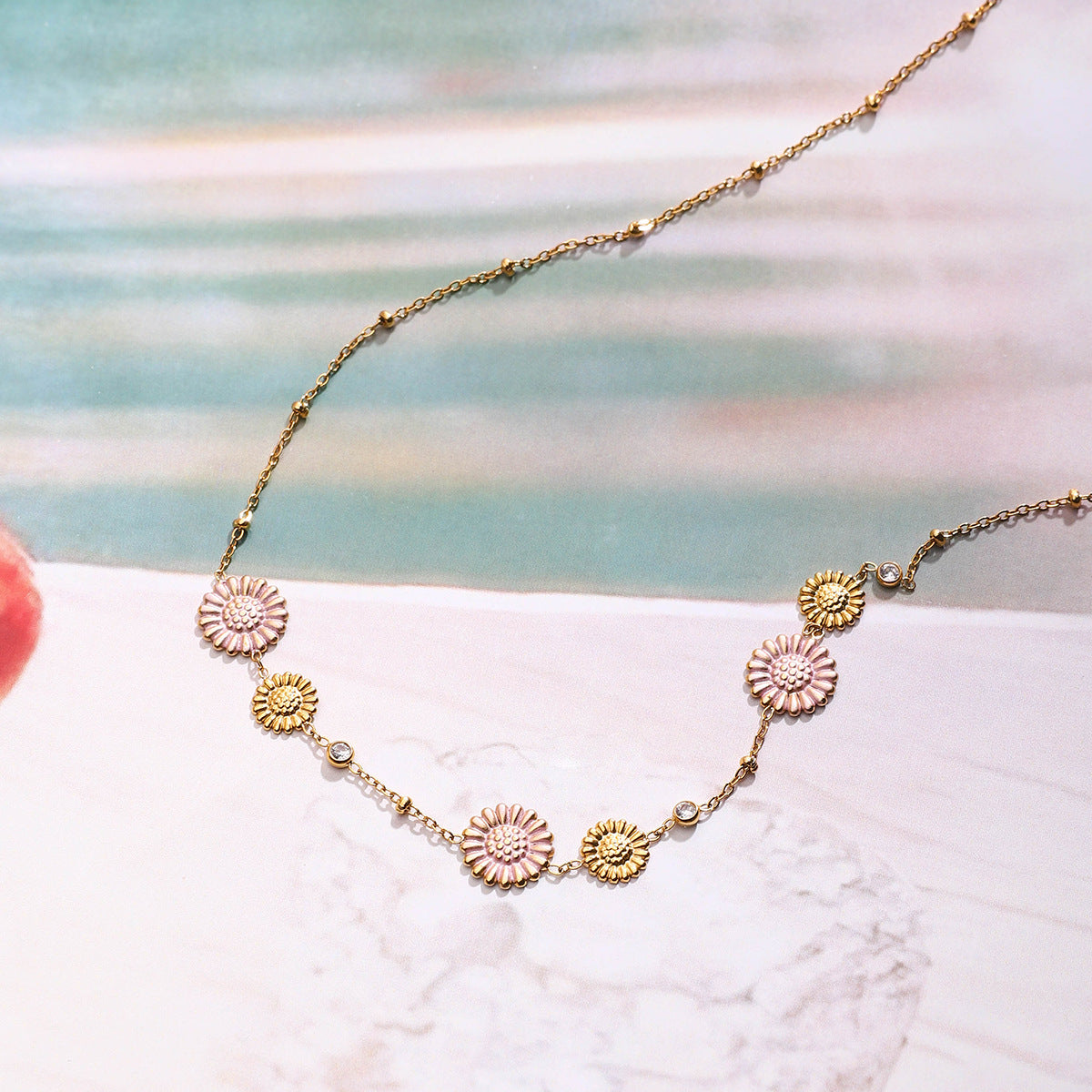 A fashionable and sweet seaside vacation style 18K gold stainless steel pink Daisy necklace